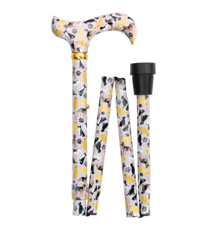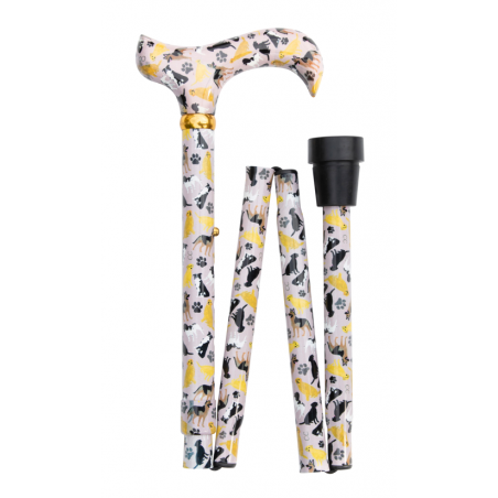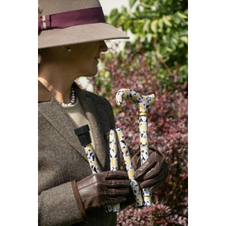 La canne pliante “Amoureux des chiens” allie praticité, confort et style unique. Réglable de 82 à 92 cm, elle est fabriquée en aluminium léger et robuste, dotée d’un embout antidérapant pour plus de sécurité et d’une poignée derby ergonomique. Son motif original peint à la main par Charlotte Gillan, représentant différentes races de chiens et des empreintes de pattes, en fait une canne aussi élégante qu’originale.