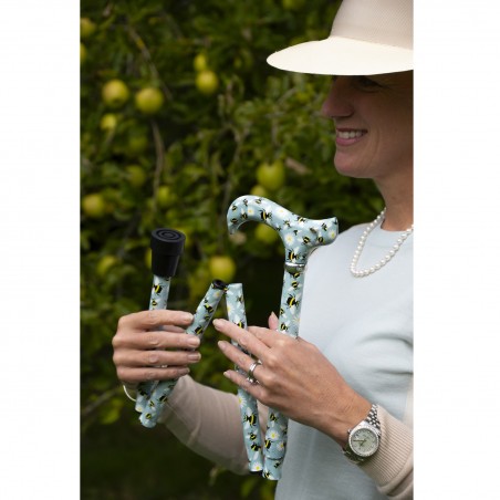 Canne de marche pliante en aluminium, décorée d’un motif gai d’abeilles noires et jaunes accompagnées de fleurs de marguerites blanches sur fond aqua.