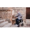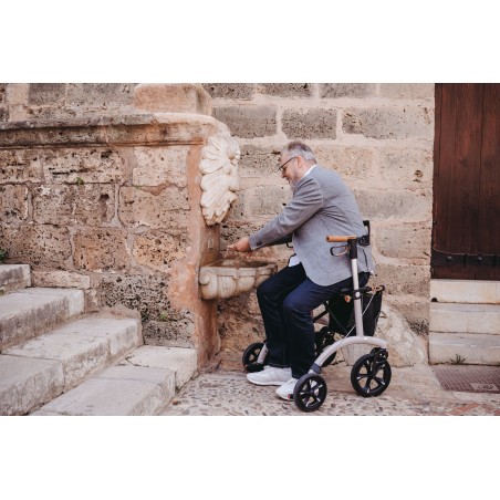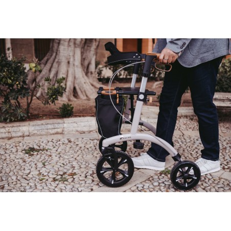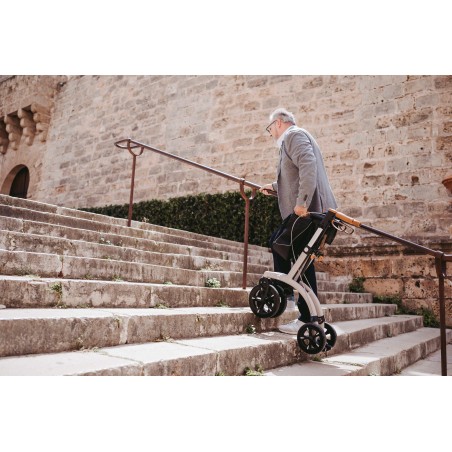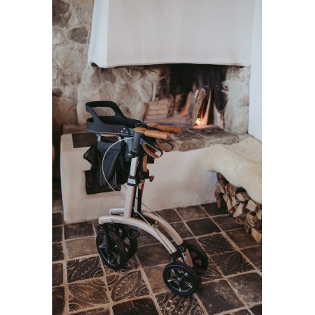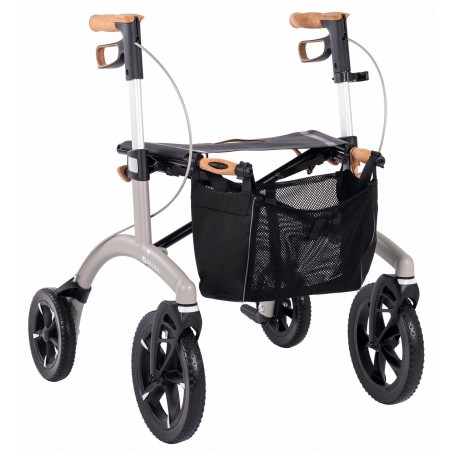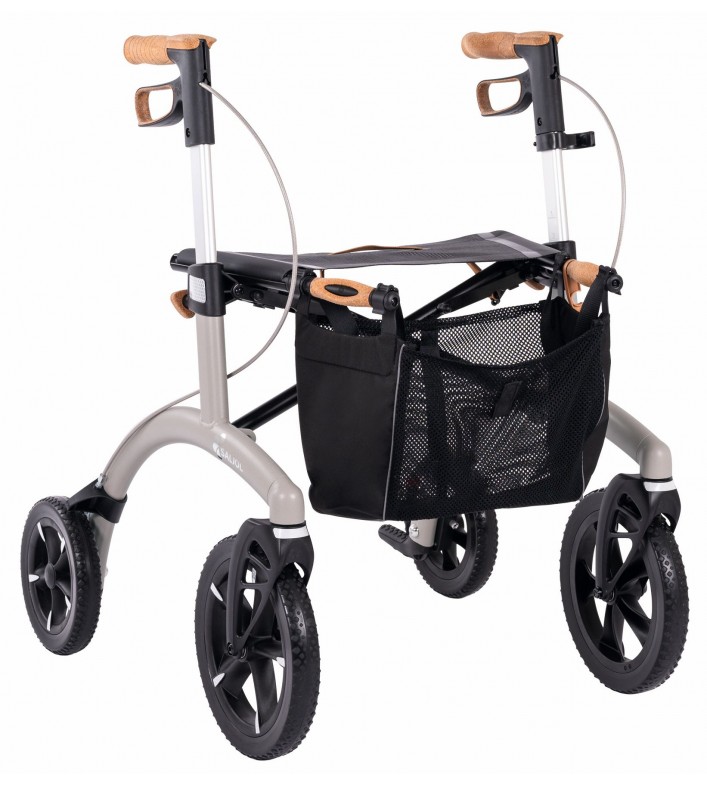 Le rollator Allround de Saljol dispose de caractéristiques premium. Il est muni de grandes roues très souples et absorbantes pour atténuer toutes les rugosités des chemins (25 cm de diamètre à l’avant). Les passe-trottoirs sont intelligemment positionnés pour faciliter le basculement du rollator. Le liège est utilisé pour les pièces de contact (poignées, freins, poignées de pliage), il absorbe les chocs et la chaleur, résiste aux UV et à l’abrasion, reste antidérapant même avec des mains humides.